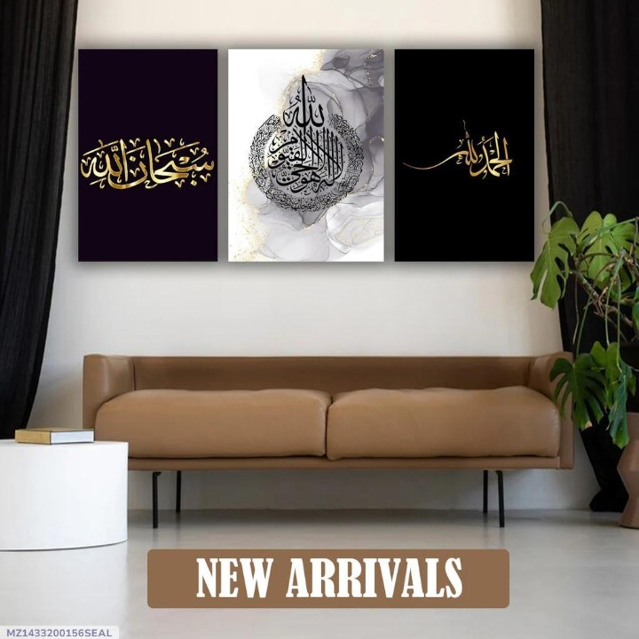 Bring timeless elegance and spiritual depth into your home with this stunning 3-piece Islamic Calligraphy Wall Art Set, crafted to elevate any interior with its rich design and meaningful presence. Each frame showcases a unique Arabic calligraphy piece—gracefully rendered in gold and black tones against bold, artistic backgrounds. From deep purples to abstract grays and classic black, the color palette adds a dramatic yet refined touch to your living space.Expertly made from premium wooden material, these frames offer durability and a warm, natural finish that complements both contemporary and traditional decor styles. Whether you’re creating a serene prayer corner or adding a statement piece to your living room, this set blends faith and artistry in perfect harmony.Choose from two versatile sizes—8×11 inches and 12×16 inches—to suit your wall space and design preferences. Each frame comes with double-sided tape for easy, damage-free wall mounting, so you can effortlessly refresh your decor without tools or nails.